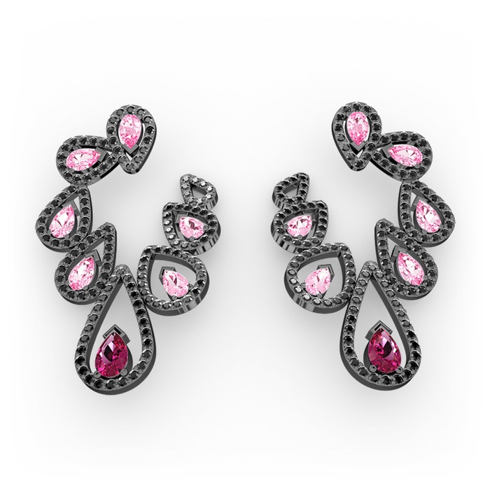 Rodolit garnet, pembe kuvars ve siyah zirkon 925 ayar siyah rodyum kaplama gümüş küpe
