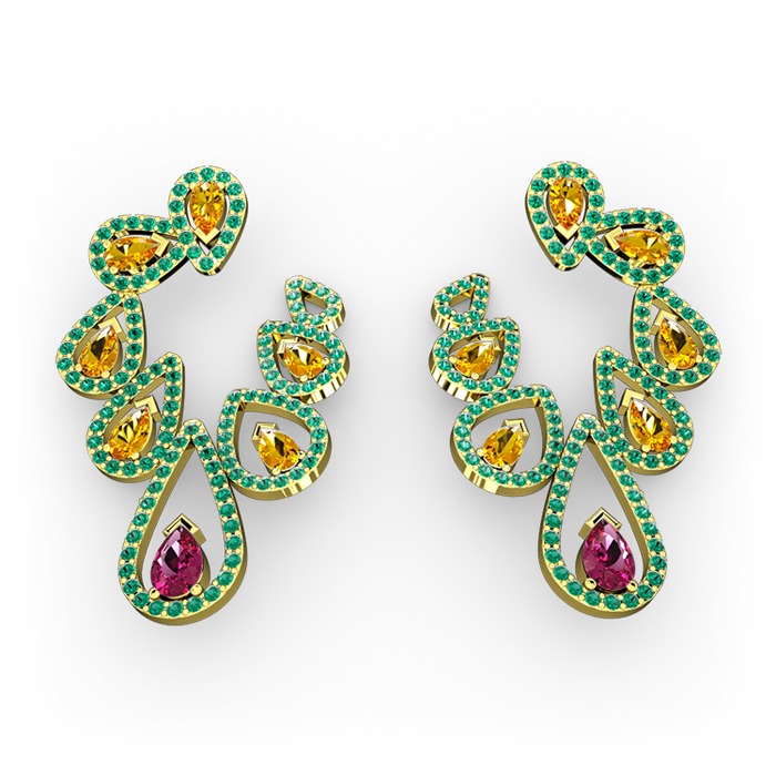 Rodolit garnet, sitrin ve yeşil kuvars 8 ayar altın küpe