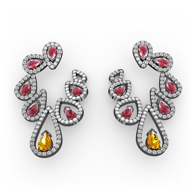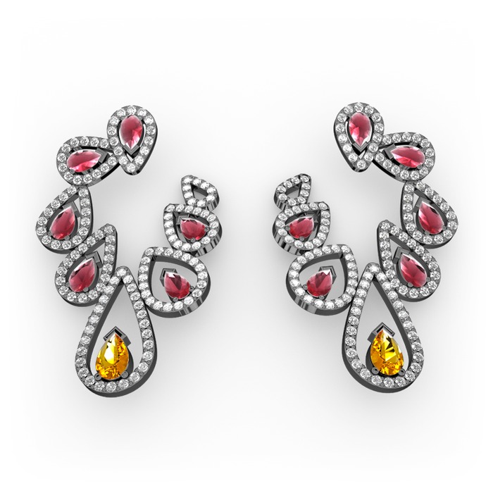 Sitrin, kök yakut ve beyaz zirkon 925 ayar siyah rodyum kaplama gümüş küpe