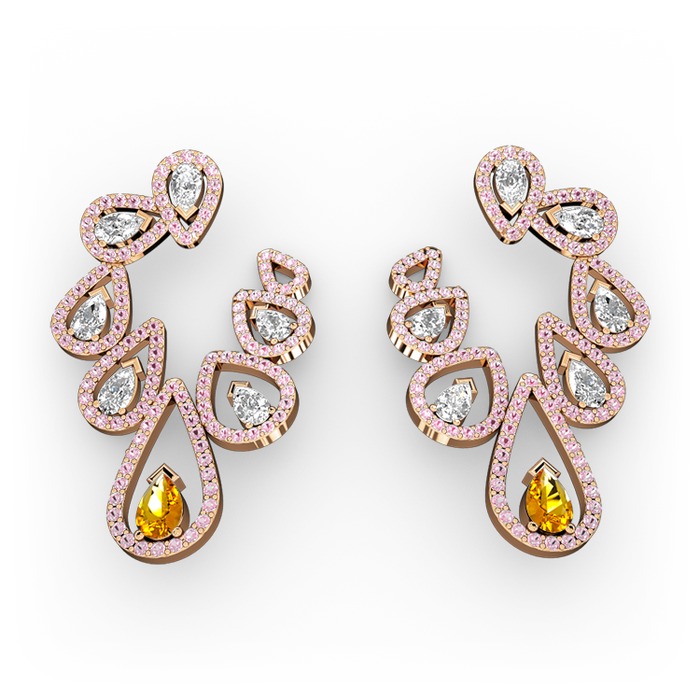 Sitrin, swarovski ve pembe kuvars 14 ayar rose altın küpe