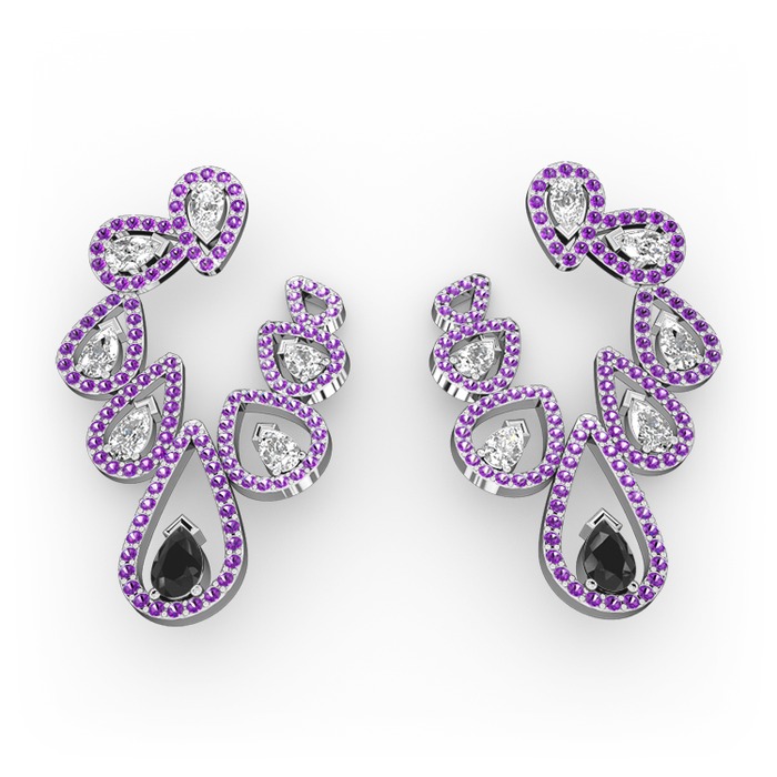 Siyah zirkon, beyaz zirkon ve ametist 14 ayar beyaz altın küpe