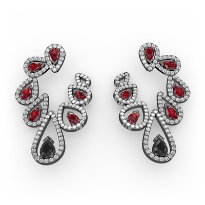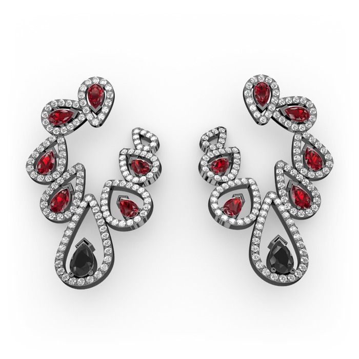 Siyah zirkon, garnet ve pırlanta 925 ayar siyah rodyum kaplama gümüş küpe (2.882 karat)