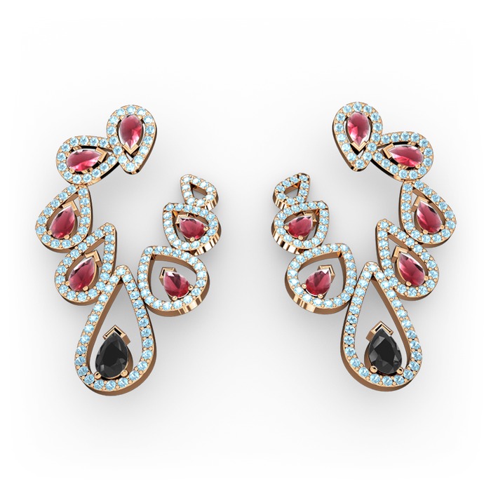 Siyah zirkon, kök yakut ve akuamarin 8 ayar rose altın küpe