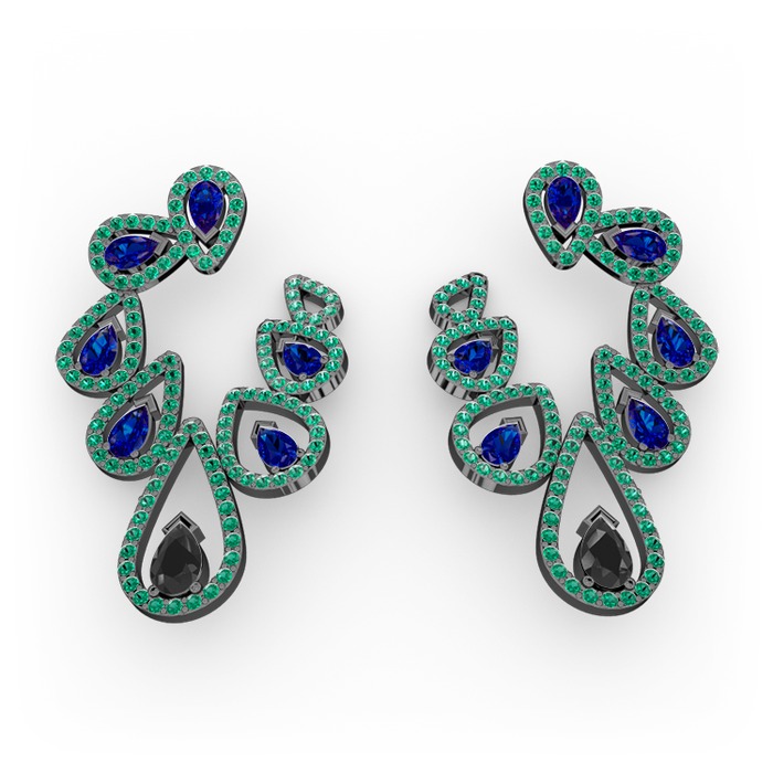 Siyah zirkon, lab safir ve yeşil kuvars 925 ayar siyah rodyum kaplama gümüş küpe
