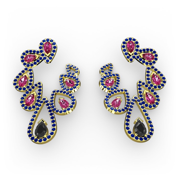 Siyah zirkon, rodolit garnet ve lab safir 18 ayar altın küpe
