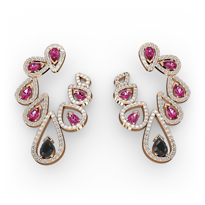 Siyah zirkon, rodolit garnet ve swarovski 8 ayar rose altın küpe