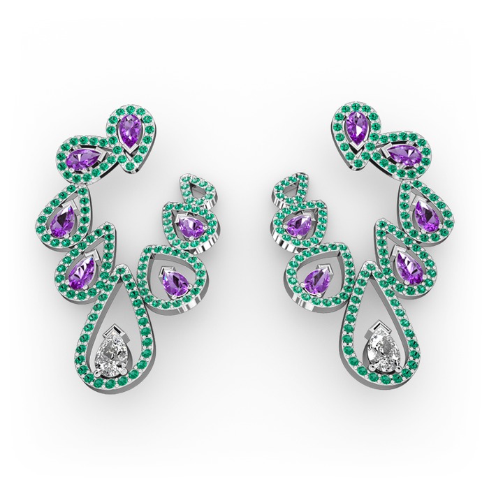 Swarovski, ametist ve yeşil kuvars 14 ayar beyaz altın küpe