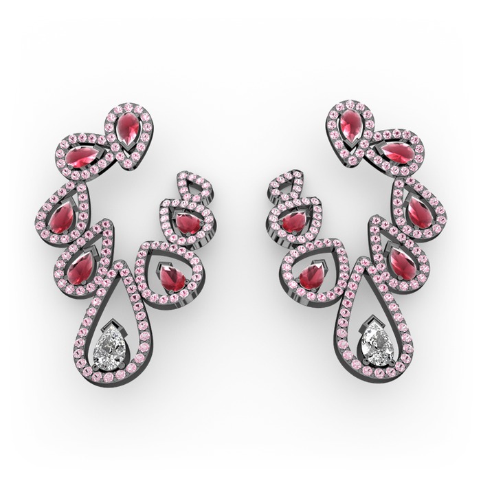 Swarovski, kök yakut ve pembe kuvars 925 ayar siyah rodyum kaplama gümüş küpe