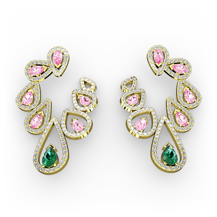 Yeşil kuvars, pembe kuvars ve beyaz zirkon 8 ayar altın küpe