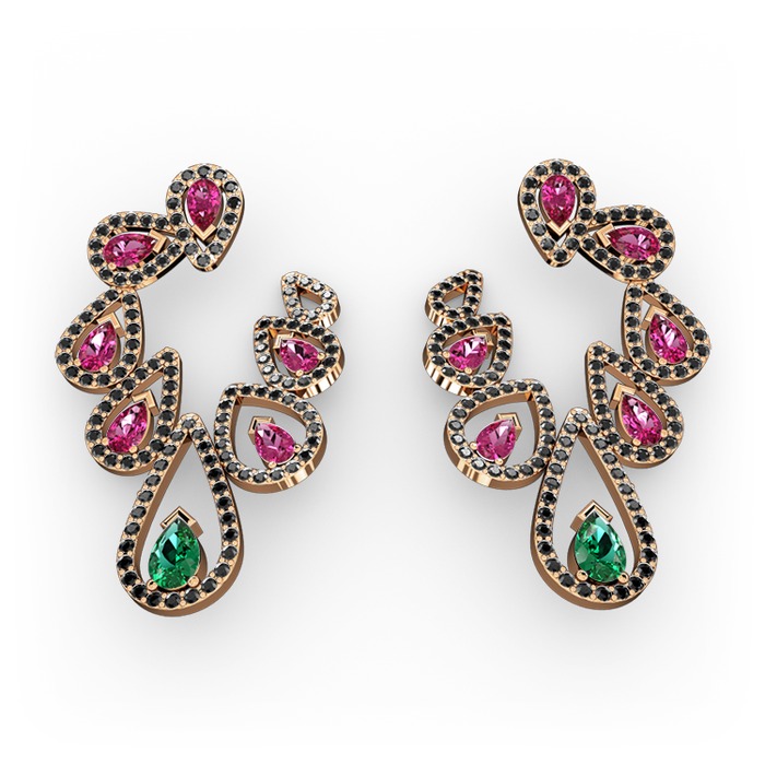 Yeşil kuvars, rodolit garnet ve siyah zirkon 18 ayar rose altın küpe