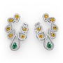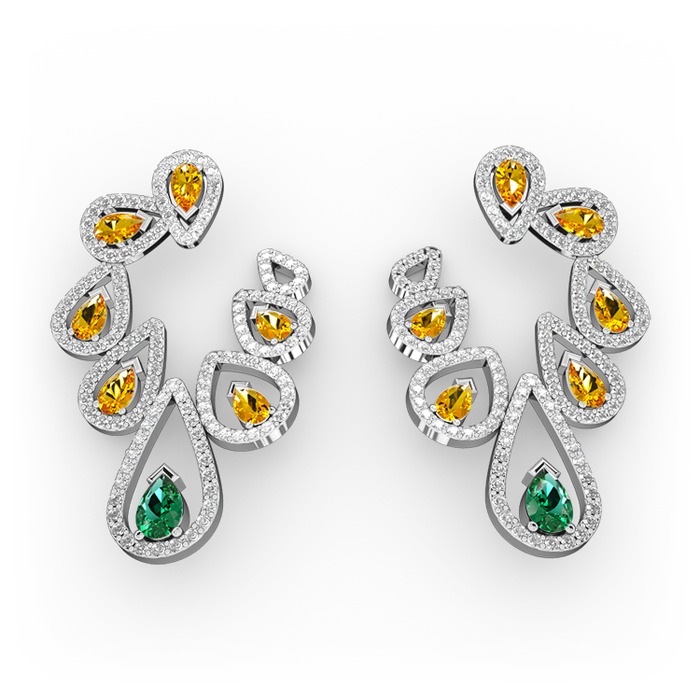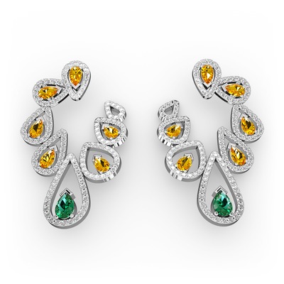 Yeşil kuvars, sitrin ve beyaz zirkon 14 ayar beyaz altın küpe