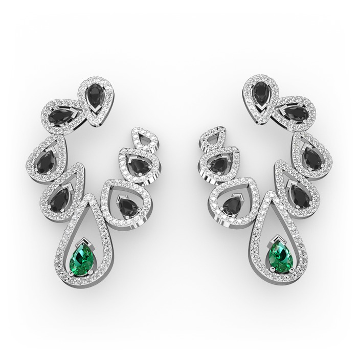 Yeşil kuvars, siyah zirkon ve pırlanta 14 ayar beyaz altın küpe (2.882 karat)