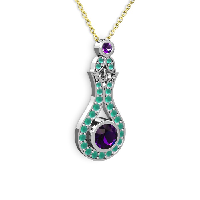 Ametist ve kök zümrüt 18 ayar beyaz altın kolye (40 cm altın rolo zincir)