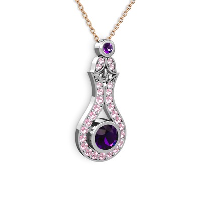 Ametist ve pembe kuvars 14 ayar beyaz altın kolye (40 cm rose altın rolo zincir)