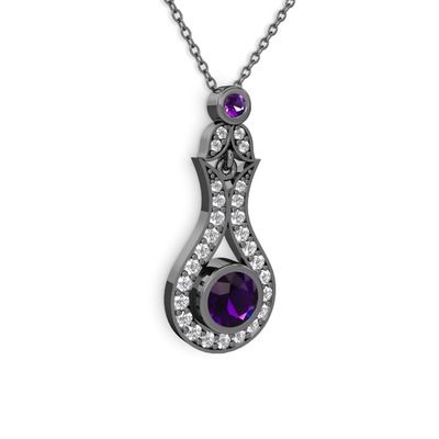 Ametist ve swarovski 925 ayar siyah rodyum kaplama gümüş kolye (40 cm gümüş rolo zincir)