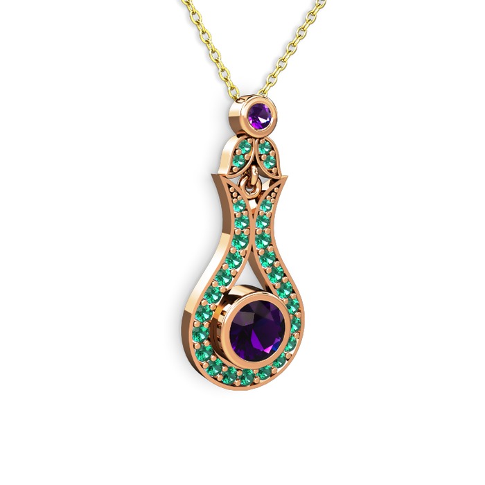 Ametist ve yeşil kuvars 14 ayar rose altın kolye (40 cm altın rolo zincir)
