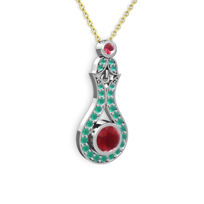 Kök yakut ve kök zümrüt 18 ayar beyaz altın kolye (40 cm altın rolo zincir)