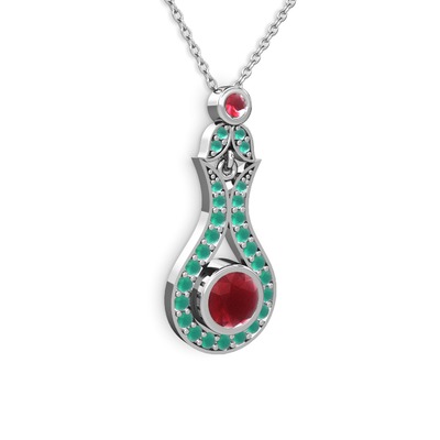 Kök yakut ve kök zümrüt 18 ayar beyaz altın kolye (40 cm beyaz altın rolo zincir)