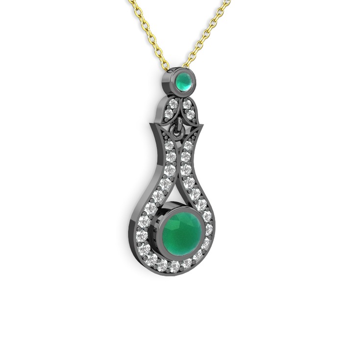 Kök zümrüt ve beyaz zirkon 925 ayar siyah rodyum kaplama gümüş kolye (40 cm altın rolo zincir)