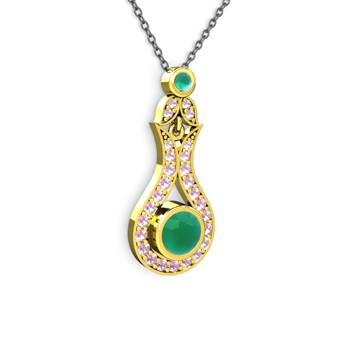 Kök zümrüt ve pembe kuvars 14 ayar altın kolye (40 cm gümüş rolo zincir)