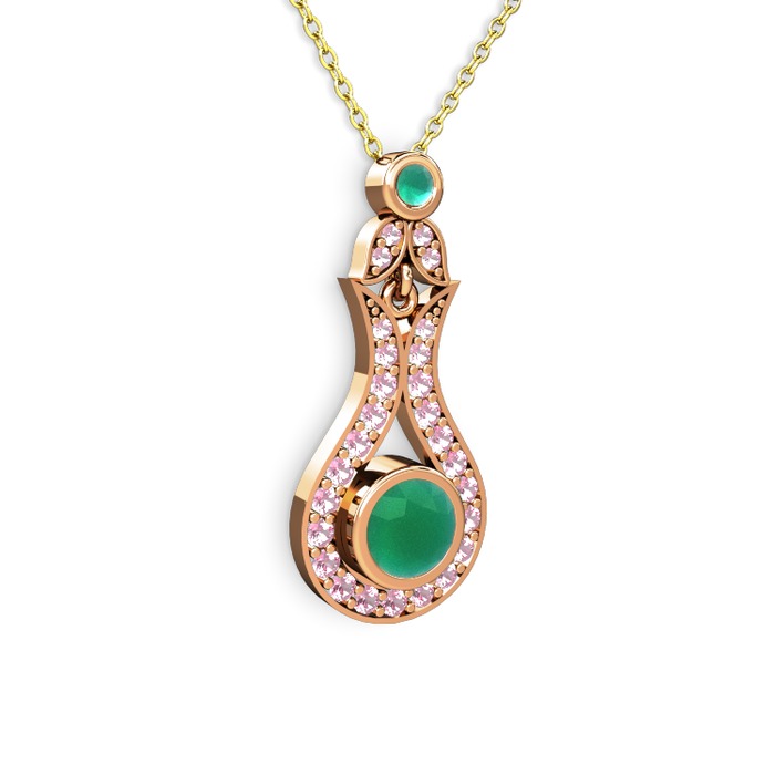 Kök zümrüt ve pembe kuvars 18 ayar rose altın kolye (40 cm altın rolo zincir)