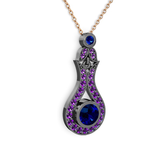 Lab safir ve ametist 925 ayar siyah rodyum kaplama gümüş kolye (40 cm rose altın rolo zincir)