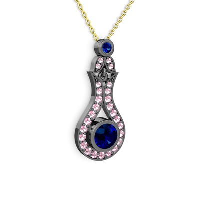 Lab safir ve pembe kuvars 925 ayar siyah rodyum kaplama gümüş kolye (40 cm altın rolo zincir)