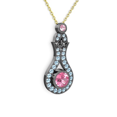 Pembe kuvars ve akuamarin 925 ayar siyah rodyum kaplama gümüş kolye (40 cm gümüş rolo zincir)