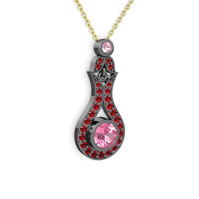 Pembe kuvars ve garnet 925 ayar siyah rodyum kaplama gümüş kolye (40 cm altın rolo zincir)