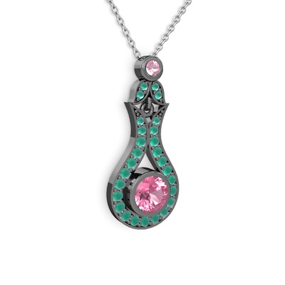 Pembe kuvars ve kök zümrüt 925 ayar siyah rodyum kaplama gümüş kolye (40 cm beyaz altın rolo zincir)