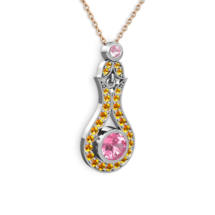 Pembe kuvars ve sitrin 14 ayar beyaz altın kolye (40 cm rose altın rolo zincir)