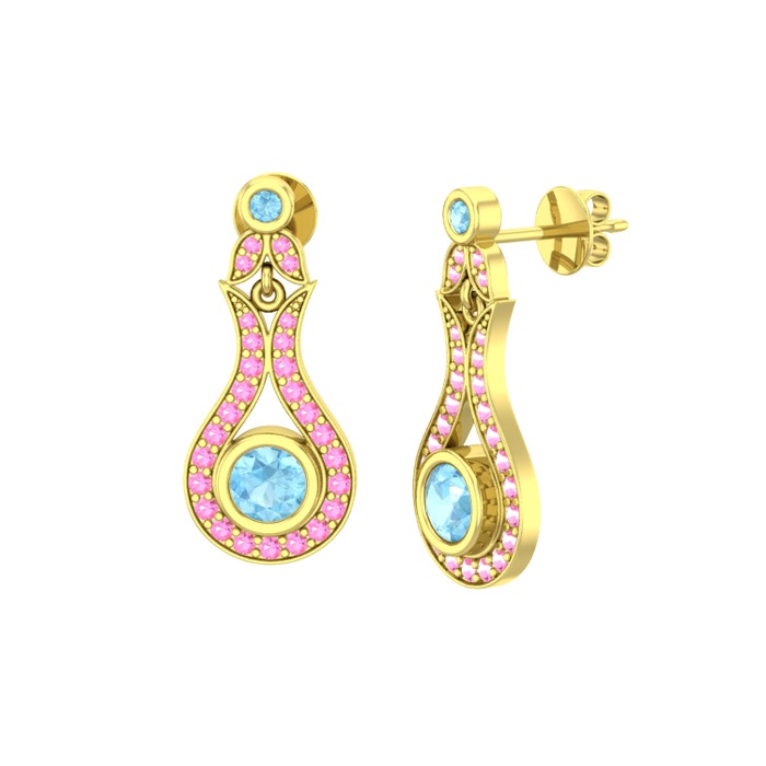 Akuamarin ve pembe kuvars 18 ayar altın küpe