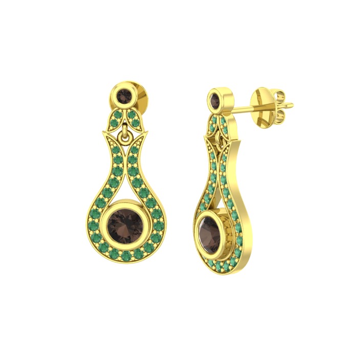 Dumanlı kuvars ve kök zümrüt 14 ayar altın küpe