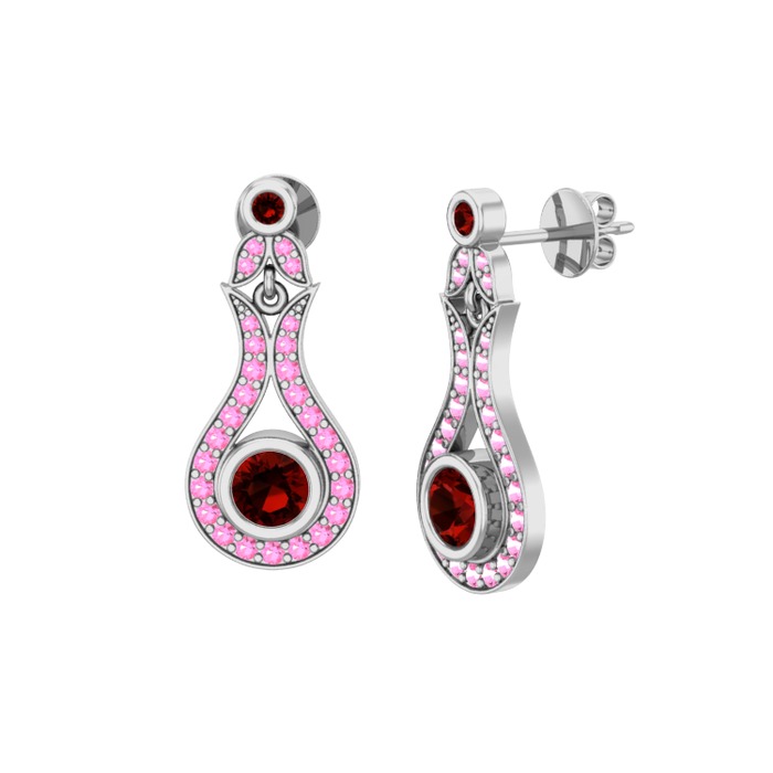 Garnet ve pembe kuvars 8 ayar beyaz altın küpe