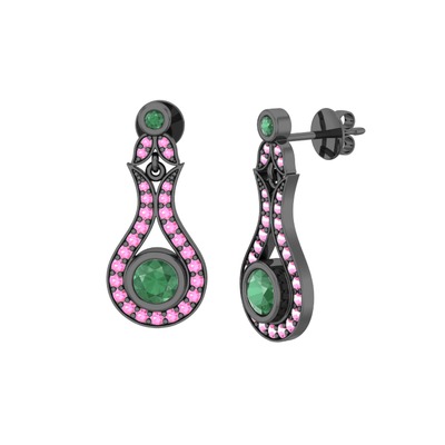 Kök zümrüt ve pembe kuvars 925 ayar siyah rodyum kaplama gümüş küpe