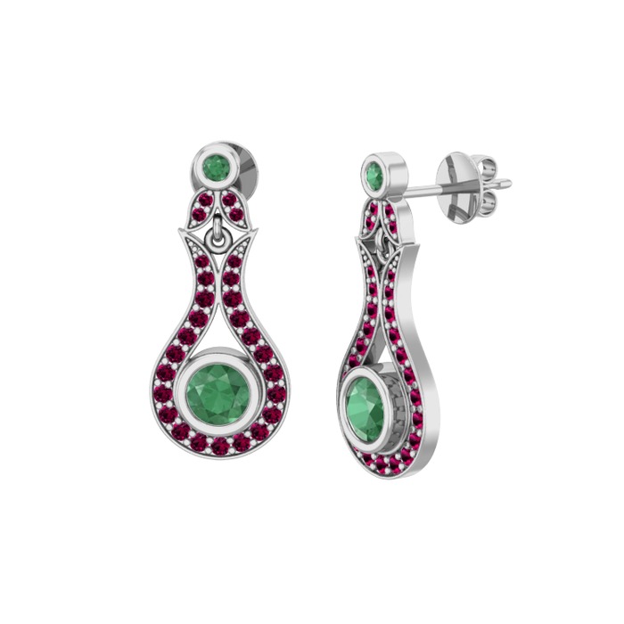Kök zümrüt ve rodolit garnet 8 ayar beyaz altın küpe