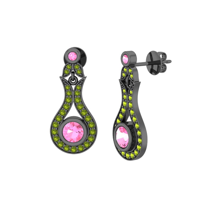 Pembe kuvars ve peridot 925 ayar siyah rodyum kaplama gümüş küpe