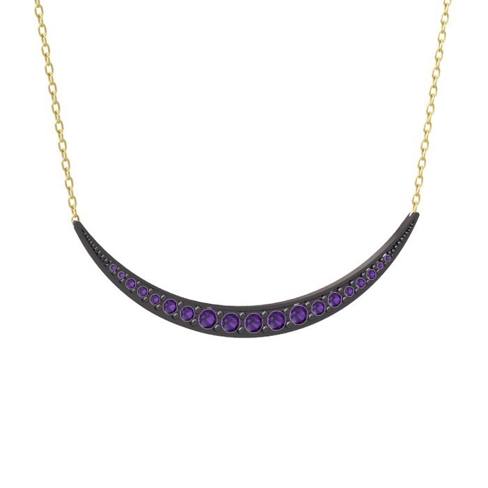 Lali Ay Kolye - Ametist 925 ayar siyah rodyum kaplama gümüş kolye (40 cm altın rolo zincir)