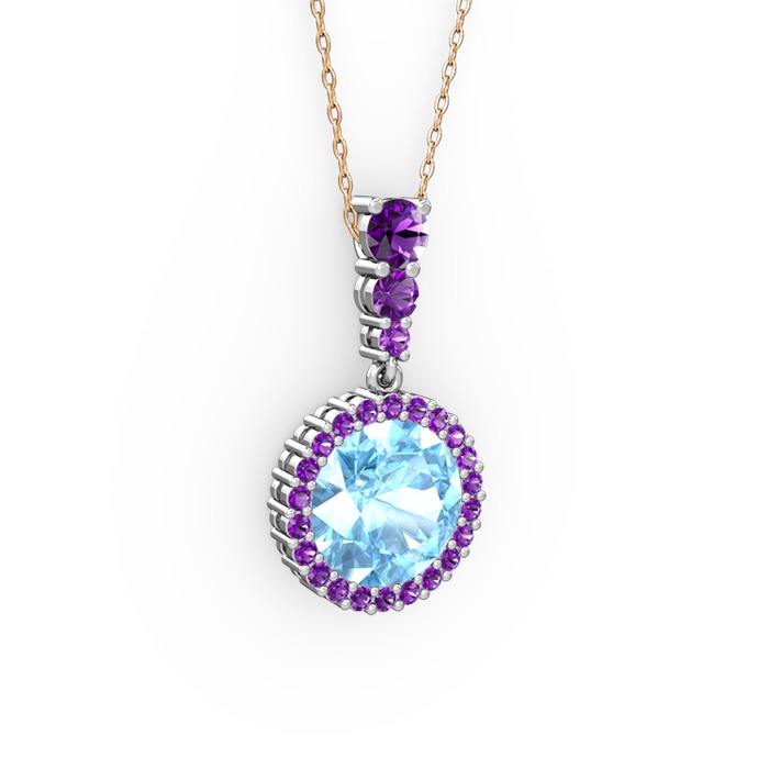 Akuamarin ve ametist 18 ayar beyaz altın kolye (40 cm rose altın rolo zincir)