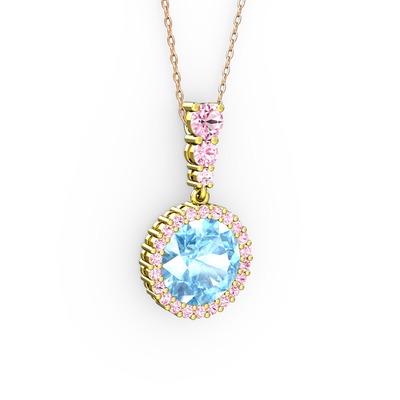 Akuamarin ve pembe kuvars 18 ayar altın kolye (40 cm rose altın rolo zincir)