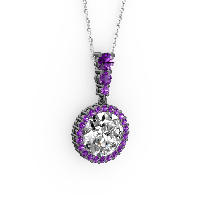 Beyaz zirkon ve ametist 925 ayar siyah rodyum kaplama gümüş kolye (40 cm gümüş rolo zincir)