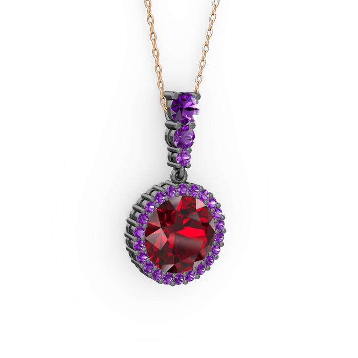 Garnet ve ametist 925 ayar siyah rodyum kaplama gümüş kolye (40 cm gümüş rolo zincir)