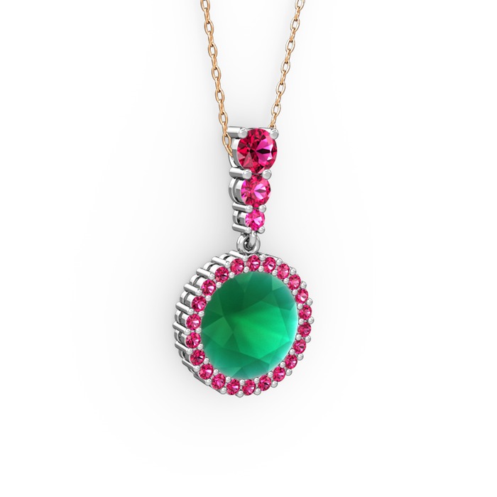 Kök zümrüt ve rodolit garnet 14 ayar beyaz altın kolye (40 cm rose altın rolo zincir)
