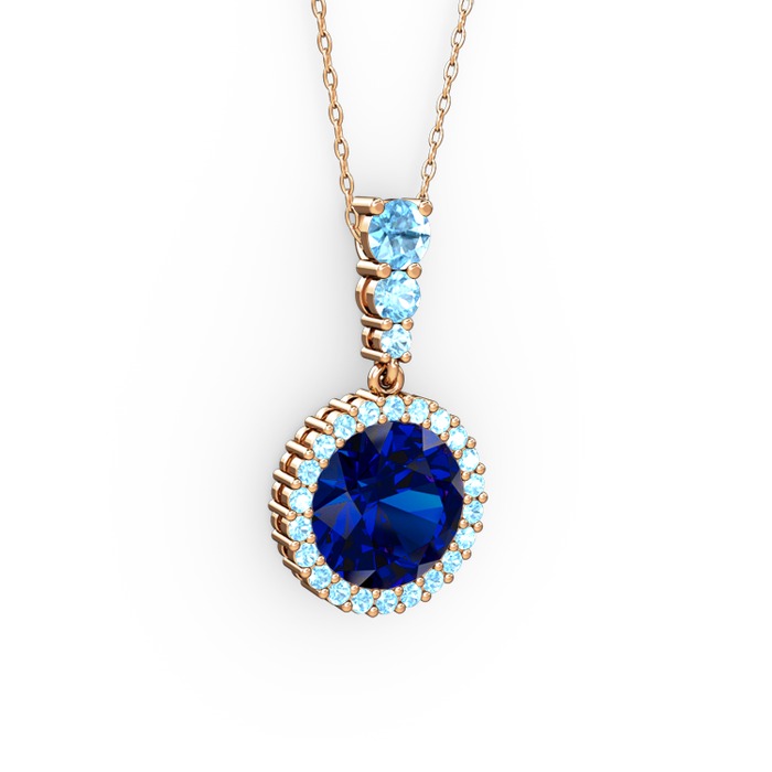 Lab safir ve akuamarin 8 ayar rose altın kolye (40 cm gümüş rolo zincir)