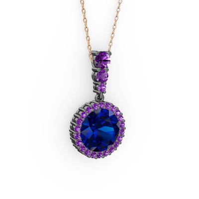 Lab safir ve ametist 925 ayar siyah rodyum kaplama gümüş kolye (40 cm rose altın rolo zincir)