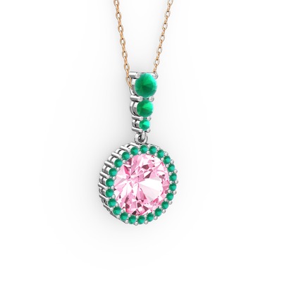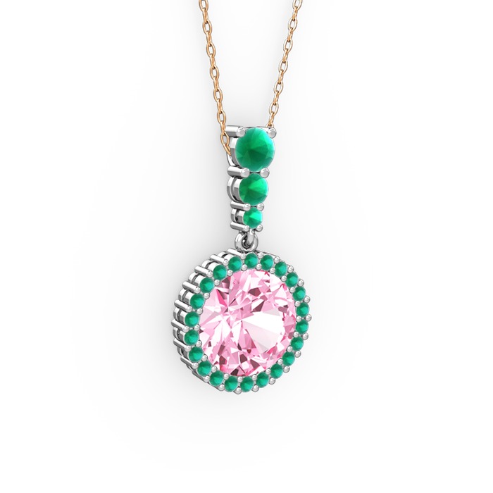 Pembe kuvars ve kök yakut 8 ayar beyaz altın kolye (40 cm rose altın rolo zincir)