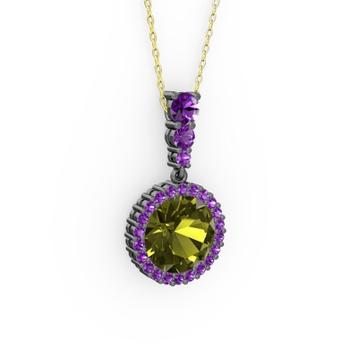Peridot ve ametist 925 ayar siyah rodyum kaplama gümüş kolye (40 cm altın rolo zincir)