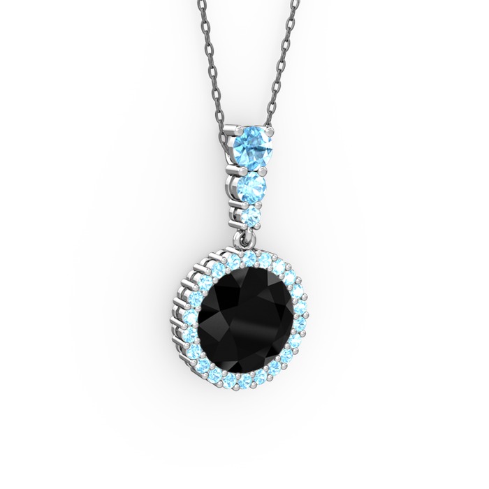 Siyah zirkon ve akuamarin 14 ayar beyaz altın kolye (40 cm gümüş rolo zincir)