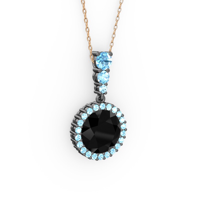 Siyah zirkon ve akuamarin 925 ayar siyah rodyum kaplama gümüş kolye (40 cm rose altın rolo zincir)