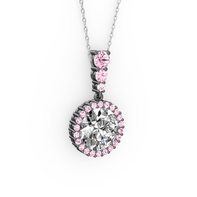 Swarovski ve pembe kuvars 925 ayar siyah rodyum kaplama gümüş kolye (40 cm beyaz altın rolo zincir)